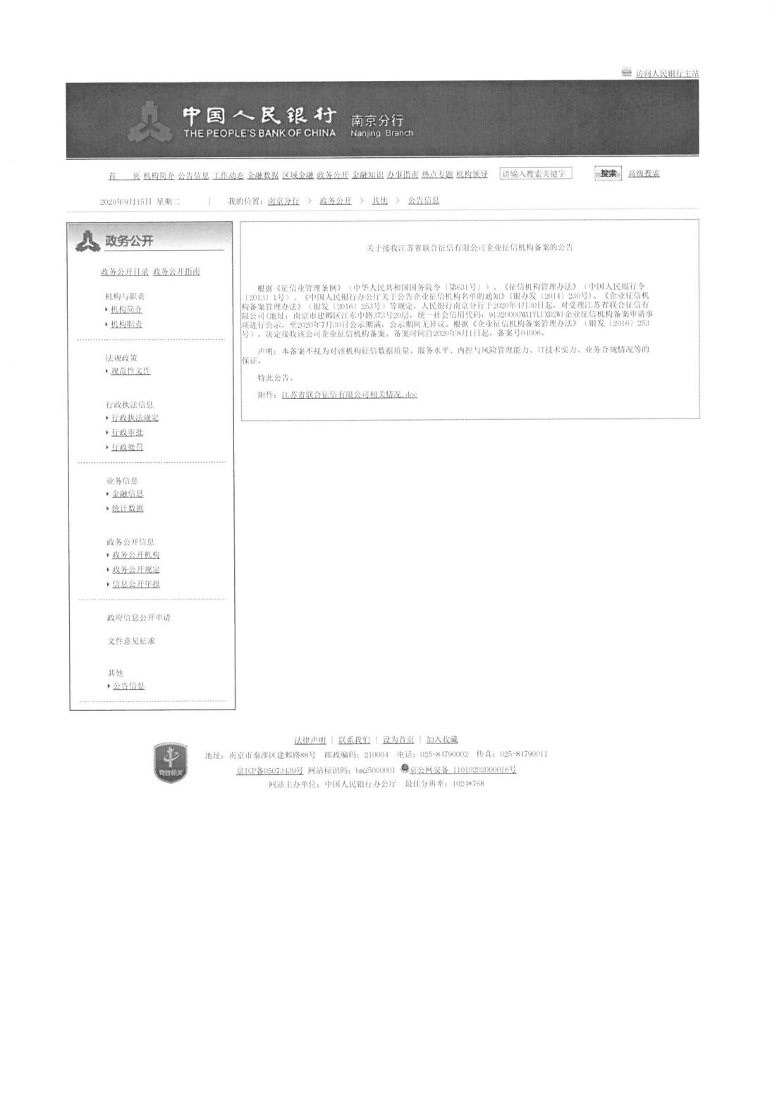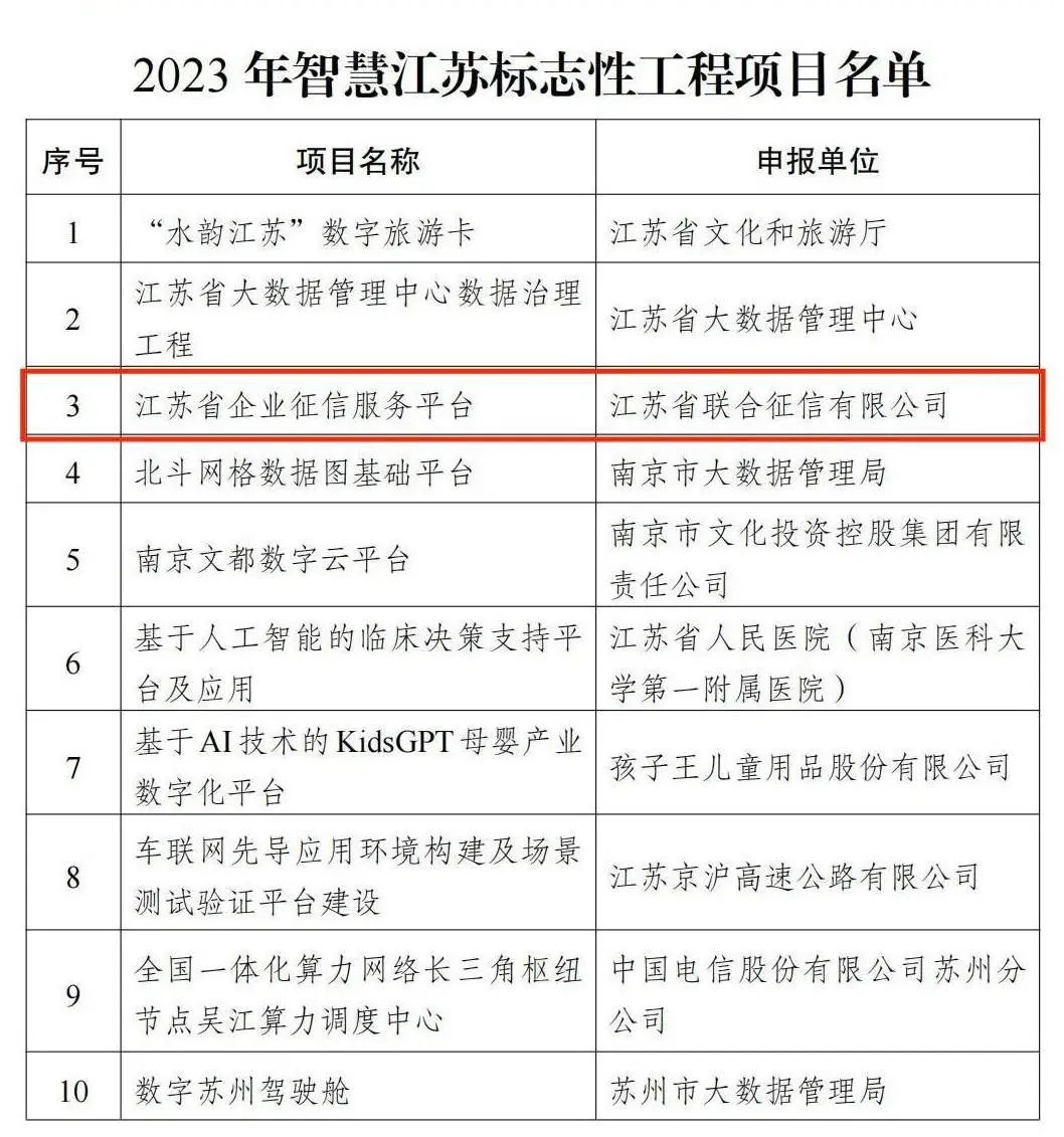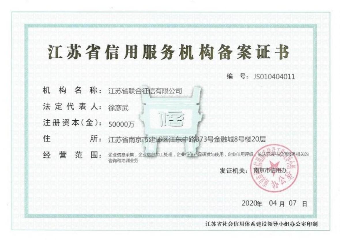 江苏省联合征信有限公司是经江苏省人民政府批准于2019年6月成立的省属国有企业,注册资本5亿元。根据省政府批复,公司由江苏省国资委列名监管,人民银行南京分行负责行业监管,江苏省地方金融监管局负责行业指导。公司于2020年获批人民银行企业征信机构备案资质、江苏省信用服务机构备案证书。 按照江苏省委省政府决策部署,公司围绕“一体两翼,双轮驱动”的运作模式,基于省联合征信公司主体,全面承担江苏省综合金融服务平台的技术支持和日常管理;研发建设省级企业征信平台,多维度归集企业信用信息,并提供征信服务;参与完善江苏省金融服务基础设施建设,服务各级政府、金融机构和中小微企业,推动金融服务实体经济发展。
